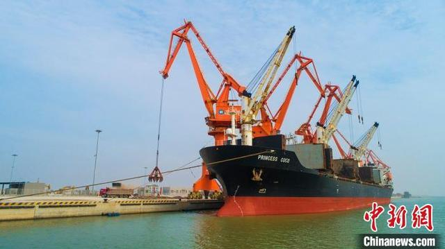1日上午,靠泊在江蘇鹽城港濱海港區通用碼頭、滿載著從印度尼西亞進口的兩萬噸鎳鐵的利比里亞籍貨輪緊張有序地進行卸貨作業。這是鹽城港濱海港區一類口岸正式對外開放后迎來的首艘外貿貨輪。