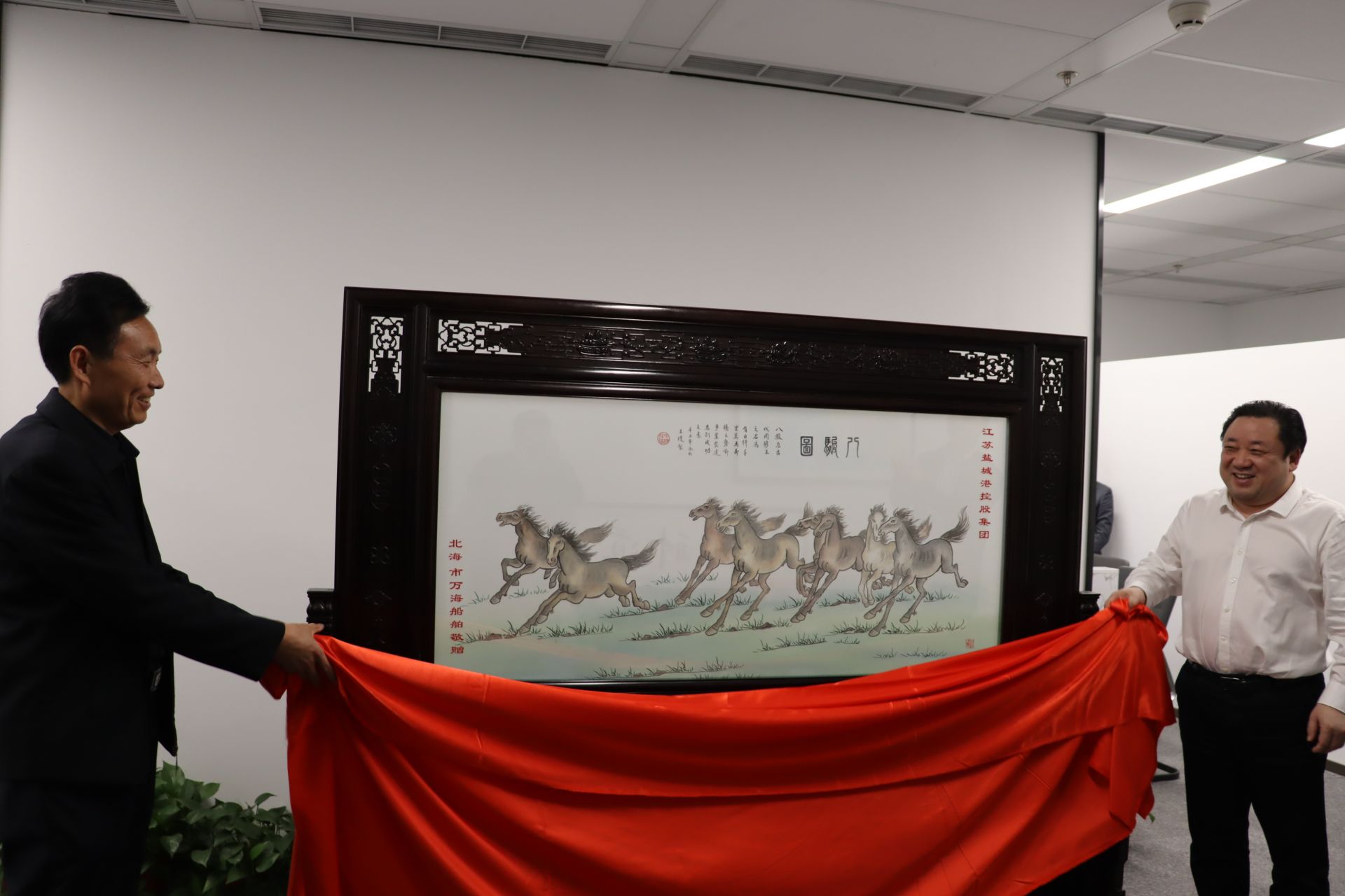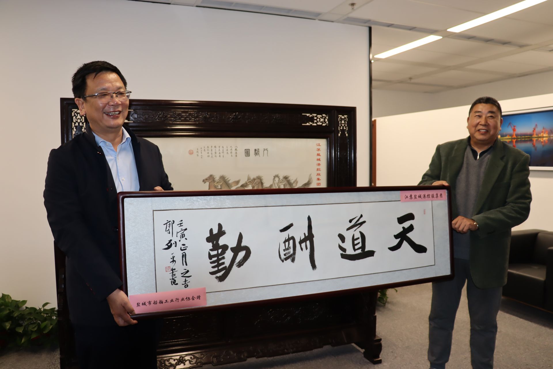 3月10日下午,鹽城市交通運(yùn)輸局、市交通運(yùn)輸綜合行政執(zhí)法支隊(duì)、市綜合交通學(xué)會(huì)和市船舶工業(yè)行業(yè)協(xié)會(huì)來到鹽城港控股集團(tuán)進(jìn)行授匾調(diào)研洽談,在集疏運(yùn)體系建設(shè)與發(fā)展、一線員工安全技能培訓(xùn)及船舶設(shè)計(jì)與制造等事宜雙方達(dá)成共識(shí)。集團(tuán)黨委書記、董事長、總經(jīng)理周正雄和集團(tuán)黨委委員、董事、副總經(jīng)理夏立新及市綜合交通學(xué)會(huì)副理事長潘進(jìn)山、市地方海事局原局長周炳學(xué)共同為授匾揭幕。