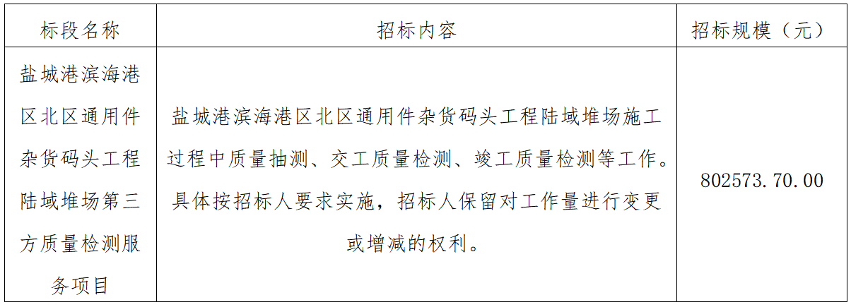 ⑴項(xiàng)目名稱:鹽城港濱海港區(qū)北區(qū)通用件雜貨碼頭工程陸域堆場第三方質(zhì)量檢測服務(wù)項(xiàng)目