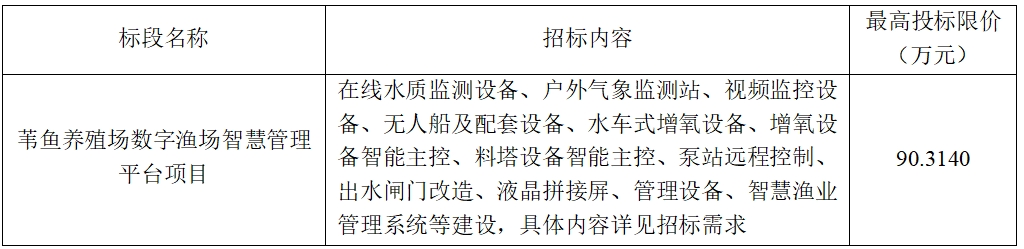 (6)項目標段劃分:葦魚養殖場數字漁場智慧管理平臺項目共劃分1個標段,標段信息如下: