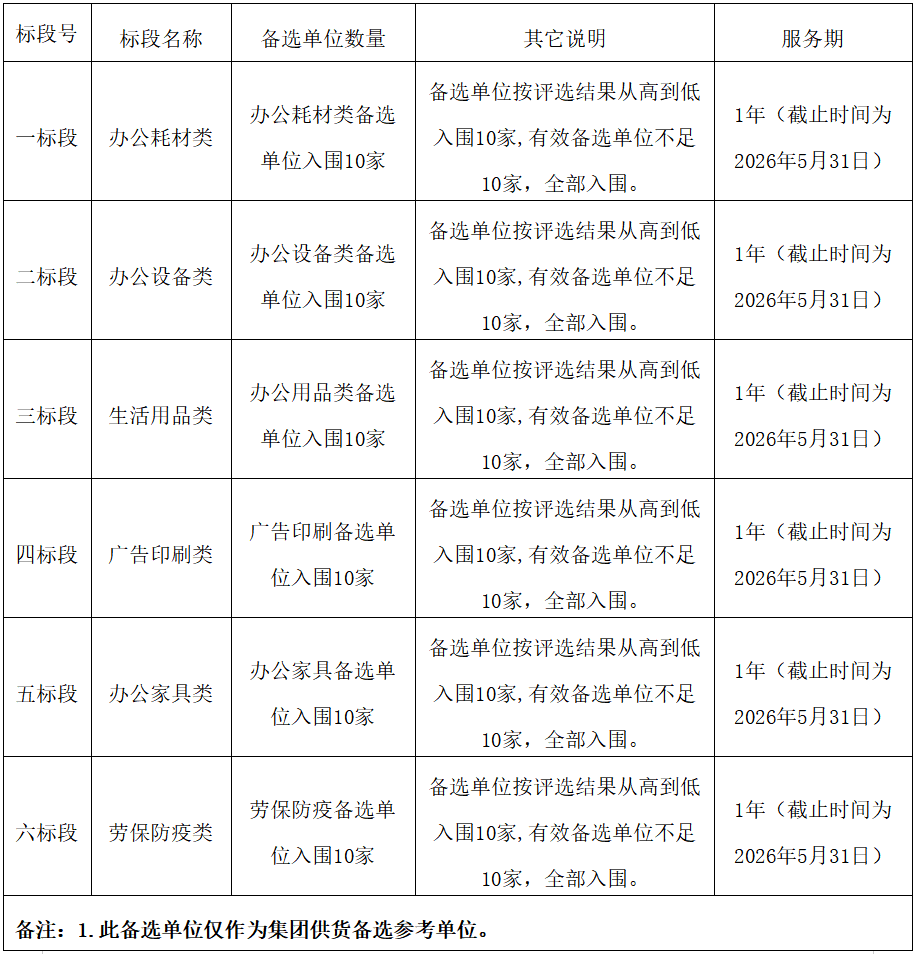 2、本次招標(biāo)項目共分為六個標(biāo)段,標(biāo)段名稱及備選數(shù)量如下:
