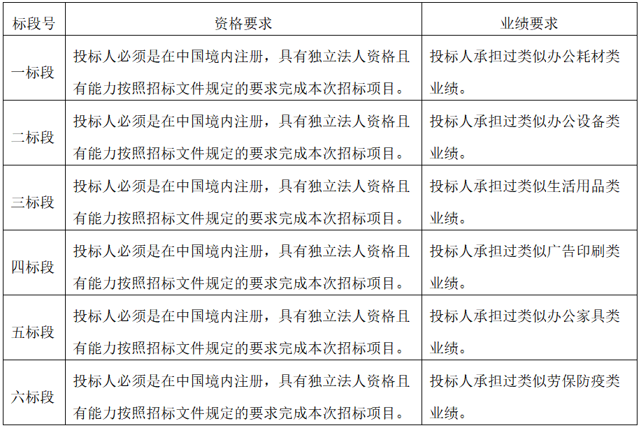 4、各標(biāo)段投標(biāo)人資格及業(yè)績要求見下表: