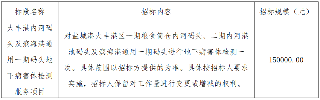 4、招標(biāo)內(nèi)容:對(duì)鹽城港大豐港區(qū)一期糧食筒倉(cāng)內(nèi)河碼頭、二期內(nèi)河港池碼頭及濱海港通用一期碼頭進(jìn)行地下病害體檢測(cè)一次。