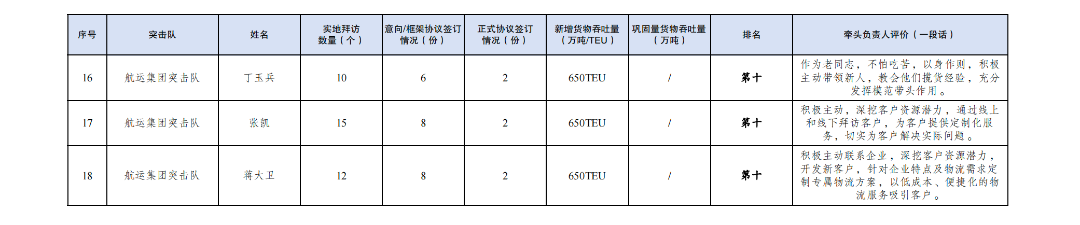 第三名:巾幗突擊隊(duì) 陳蒙(拜訪客戶184家,簽訂意向協(xié)議46份,簽訂正式協(xié)議2份,新增貨物吞吐量34TEU,鞏固量貨物吞吐量64TEU。