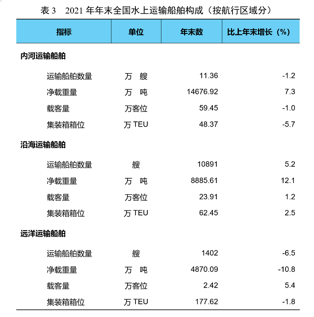 年末全國擁有水上運輸船舶12.59萬艘,比上年末下降0.7%,其中凈載重量28432.63萬噸、增長5.1%,載客量85.78萬客位、下降0.3%,集裝箱箱位288.43萬標準箱、下降1.6%。
