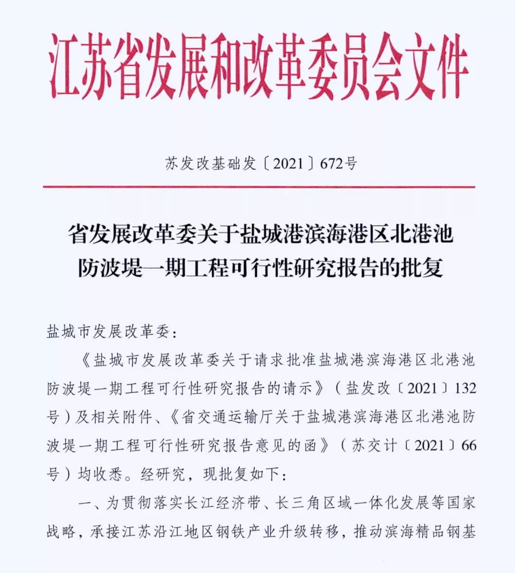 近日,交通運輸部批復鹽城港濱海港區主港池北區通用碼頭三期工程使用港口岸線的請示(交規劃函〔2021〕362號)、省發展改革委批復鹽城港濱海港區北港池防波堤一期工程可行性研究報告(蘇發改基礎發〔2021〕672號),標志濱海港區重大項目前期工作取得突破性進展。