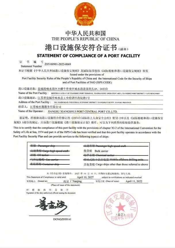 近日,在省、市相關部門、專家和咨詢單位的大力支持幫助下,響水港區、射陽港區10個萬噸級以上泊位順利獲得江蘇省交通運輸廳核發的港口設施保安符合證書,為響水港區、射陽港區一類開放口岸國家級驗收奠定了堅實基礎。