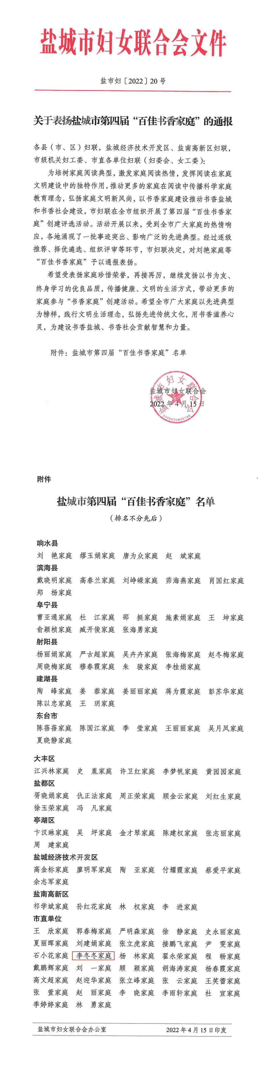 近日,從鹽城市婦女聯(lián)合會(huì)傳來好消息,在市第四屆“百佳書香家庭”評(píng)選活動(dòng)中,集團(tuán)下屬資產(chǎn)公司職工李冬冬家庭榮獲鹽城市“百佳書香家庭”稱號(hào)。
