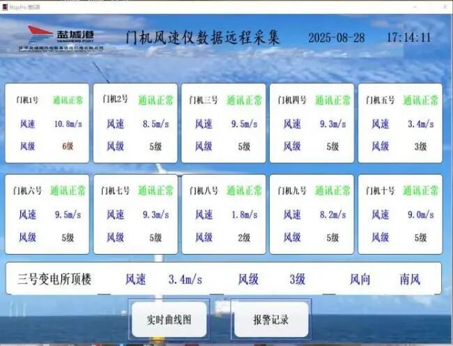 以往,門機實時風速數(shù)據(jù)僅能在司機室查看,值班室調(diào)度人員、現(xiàn)場管理人員無法同步獲取,存在信息滯后導致的安全風險。通過加裝高精度風速傳感器,搭配低延遲無線傳輸模塊,將風速數(shù)據(jù)實時推送至值班室監(jiān)控大屏與管理人員手機客戶端,數(shù)據(jù)傳輸延遲控制在3秒以內(nèi)。不僅避免了人工登高查看風速的安全隱患,更降低了因風速突變導致的設備損壞、貨物損耗風險,顯著提升港口安全智能化管理水平。