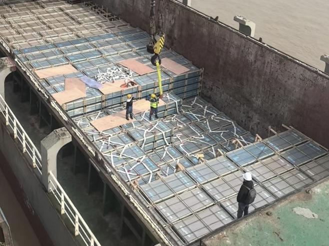 業務前端專項攻堅,全過程保障高效順暢。為確保新貨種順利落地,港區攬貨組充分發揮攻堅作用,提前與客戶、船方深度對接,全面掌握貨物特性、存儲要求與作業需求。針對光伏玻璃的存儲與轉運要求,量身定制專項卸船及堆存方案,優化碼頭前沿與后方堆場的動線銜接,實現“船到即卸、過程跟蹤”,確保了首船作業各環節無縫連接、高效運行。