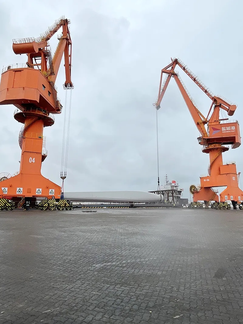 據悉,此次2套大型風電葉片采用門座式起重機的作業方式裝卸,風電葉片各長71.4米,兩套總重達280噸,該批次風電葉片將從濱海港區裝船啟運至浙江岱山機位項目處。