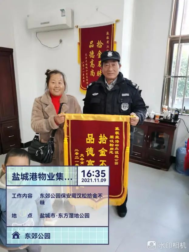 當(dāng)天,失主沈女士特地將一面寫有“品德高尚、拾金不昧”的錦旗送到東郊公園,對(duì)周漢松拾金不昧的高尚品德再一次表示感謝。