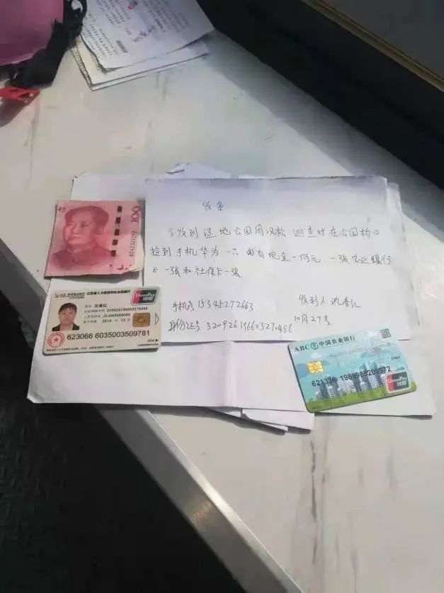 11月9日,鹽城港物業(yè)保安周漢松和往常一樣在所屬項(xiàng)目東郊公園內(nèi)巡邏執(zhí)勤,巡邏中發(fā)現(xiàn)馬路上“躺”著一部手機(jī),經(jīng)檢查手機(jī)外觀未損壞能亮屏,手機(jī)背面還有銀行卡、社??吧倭楷F(xiàn)金。周漢松第一時(shí)間將現(xiàn)場(chǎng)情況進(jìn)行上報(bào),并時(shí)刻注意著手機(jī)來(lái)電。很快便接到了外來(lái)電話,來(lái)電人自稱是失主,周漢松在電話里告知對(duì)方方位,請(qǐng)對(duì)方到達(dá)現(xiàn)場(chǎng)進(jìn)一步確認(rèn)。