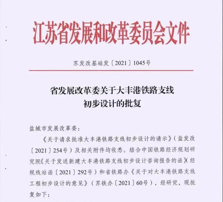 大豐港鐵路支線是國(guó)家發(fā)展改革委等五部門聯(lián)合印發(fā)的《關(guān)于加快推進(jìn)鐵路專用線建設(shè)的指導(dǎo)意見》(發(fā)改基礎(chǔ)〔2019〕1445 號(hào))文中明確的重點(diǎn)鐵路支線項(xiàng)目,鹽城市委市政府和省交通運(yùn)輸廳、省鐵路集團(tuán)計(jì)劃今年全線開工建設(shè)。