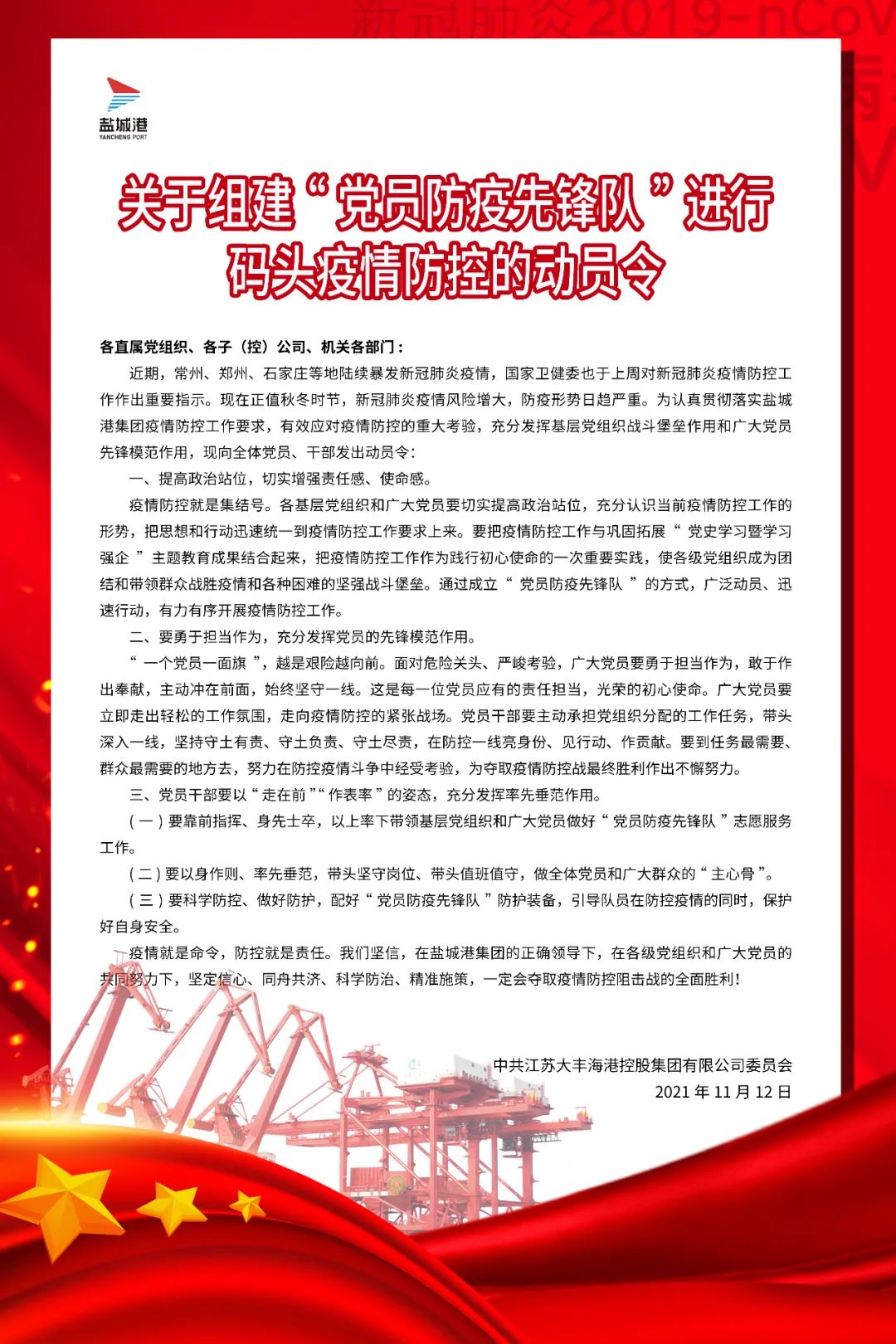 “我自愿加入港口一線黨員防疫先鋒隊(duì),提供力所能及的志愿服務(wù)……”11月15日,由大豐港區(qū)、航運(yùn)(集裝箱)集團(tuán)64名黨員組成的防疫先鋒隊(duì)向黨旗作出鄭重承諾。面對(duì)當(dāng)前疫情反復(fù)的形勢,鹽城港大豐港區(qū)積極響應(yīng)“兩在兩同””建新功行動(dòng)號(hào)召,嚴(yán)格貫徹落實(shí)鹽城港集團(tuán)疫情防控工作要求,以“50天大比武”活動(dòng)為契機(jī),充分發(fā)揮“我是黨員,向我看齊”的先鋒模范作用,讓黨旗飄揚(yáng)在疫情防控最前線,確保港口生產(chǎn)、防疫“兩手抓、兩不誤”。