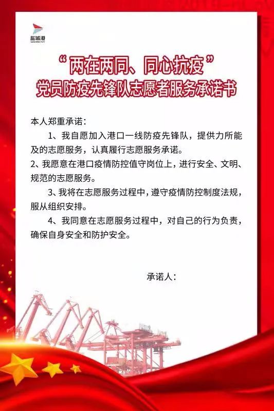 疾風(fēng)知?jiǎng)挪?,烈火見真金。疫情發(fā)生以來,大豐港區(qū)迅速行動(dòng),先后成立“許鵬志愿隊(duì)”、“黨員志愿者”等隊(duì)伍,團(tuán)結(jié)帶領(lǐng)廣大黨員多次開展支援一線疫情防控工作和走訪慰問幫扶活動(dòng),使黨員干部成為團(tuán)結(jié)和帶領(lǐng)群眾戰(zhàn)勝疫情和各種困難的“先鋒隊(duì)”和“主心骨”。集裝箱碼頭平臺(tái)上,防疫先鋒隊(duì)隊(duì)長鄭重地接下“鹽城港大豐港區(qū)黨員防疫先鋒隊(duì)”鮮紅的旗幟,64名隊(duì)員依次簽署承諾書,并接受防控疫情崗前培訓(xùn),熟悉碼頭疫情防控相關(guān)知識(shí),掌握疫情處理各項(xiàng)工作步驟。這支隊(duì)伍中,來自農(nóng)業(yè)科技公司的兩名女隊(duì)員獨(dú)具“靚”點(diǎn),她們舍小家為大家,積極投身到抗疫隊(duì)伍中,為碼頭防控一線注入了光彩奪目的“巾幗力量”。