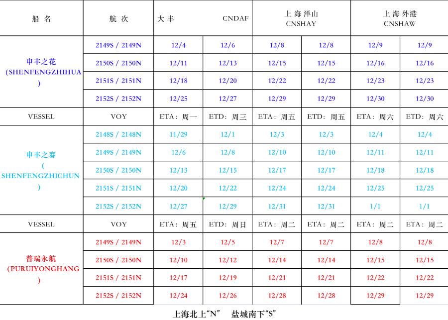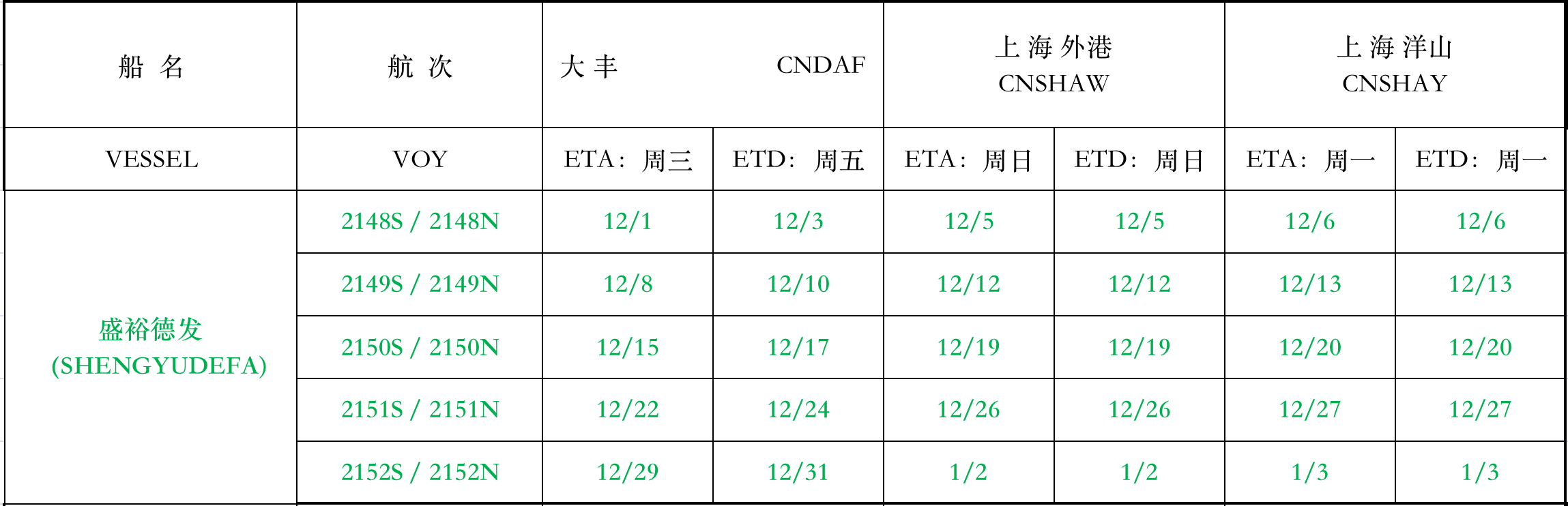 滬鹽專(zhuān)線2021年12月份沿海線船期表