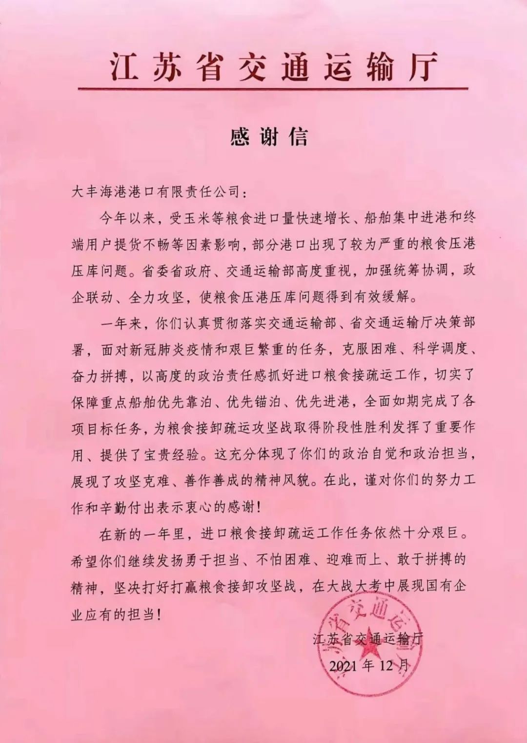 12月21日,省交通運(yùn)輸廳向集團(tuán)下屬港口公司發(fā)來感謝信,對(duì)港口公司面對(duì)新冠肺炎疫情和艱巨繁重的任務(wù),克服困難、科學(xué)調(diào)度,努力抓好進(jìn)口糧食接疏運(yùn)工作,以及廣大干部職工的努力工作和辛勤付出表示感謝。