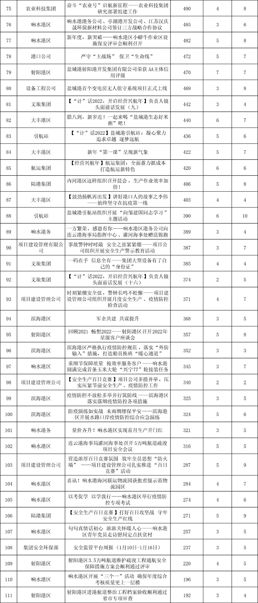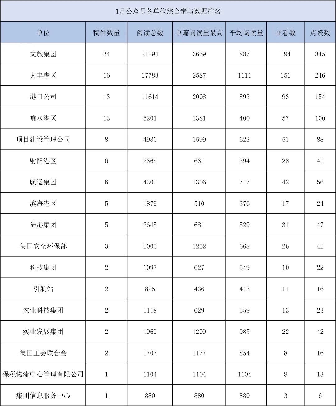 1月,“江蘇鹽城港控股集團(tuán)”微信公眾號(hào)推送文章170篇,截至目前,閱讀總量14萬+,各單位供稿111篇。其中,文旅集團(tuán)以2.1萬閱讀數(shù),24篇稿件量,遙遙領(lǐng)先;大豐港區(qū)以1.8萬閱讀數(shù),16篇稿件量,位列第二;港口公司、響水港區(qū)在供稿方面,以同樣13篇的數(shù)量并列第三,在閱讀量方面,港口公司以1.2萬的數(shù)量,位列單項(xiàng)第三;其他港口及板塊集團(tuán)積極參與,踴躍投稿,情況較好。