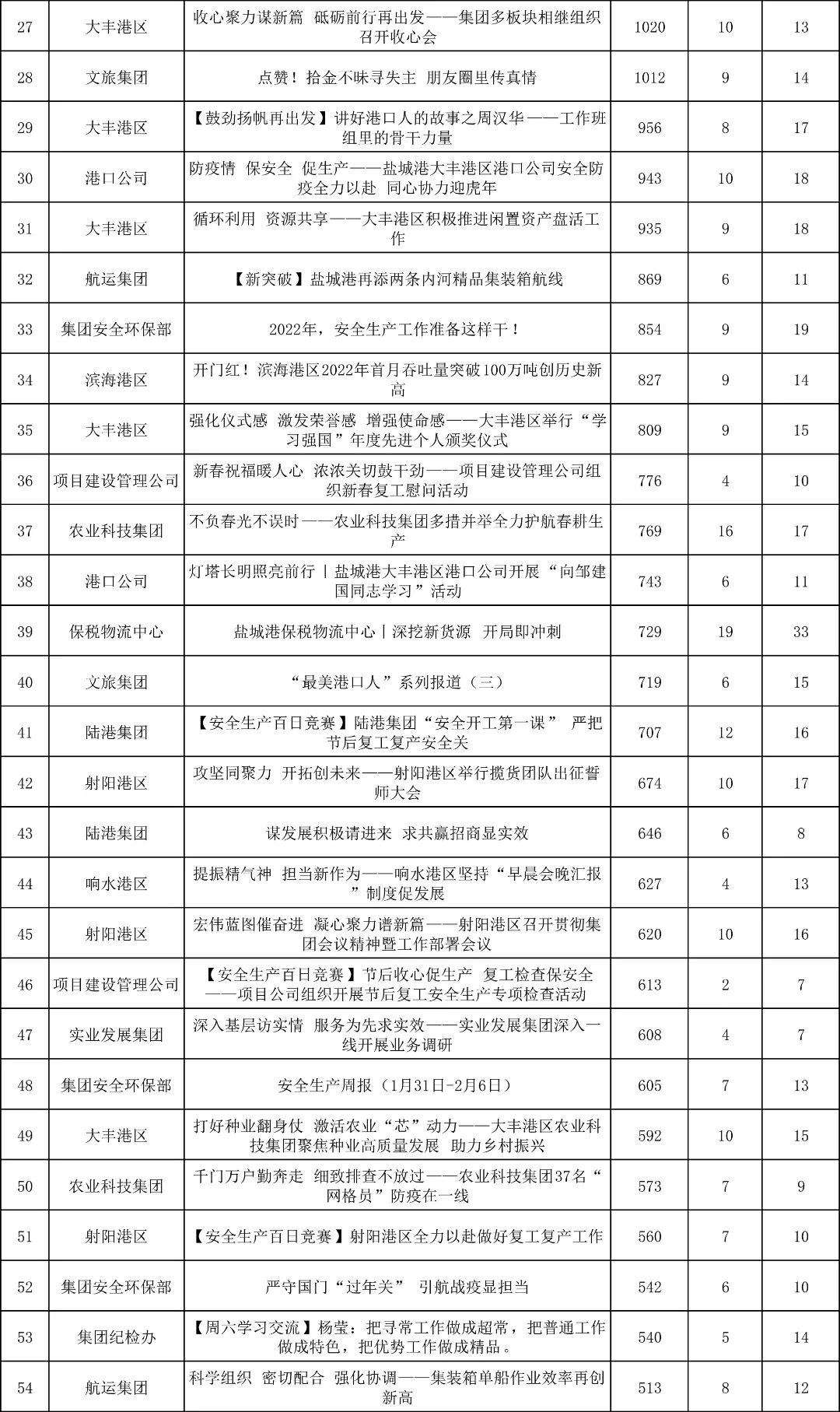 “首季開門紅”向來是新聞報道的高產(chǎn)期,特別是一線生產(chǎn)單位亮點頻出。從二月份稿件數(shù)據(jù)統(tǒng)計來看,大豐港區(qū)依然蟬聯(lián)第一“寶座”,發(fā)稿18篇;港口公司繼續(xù)發(fā)力,成稿11篇,位列第二;響水港區(qū)緊隨其后,發(fā)稿9篇。其他單位齊齊發(fā)力,紛紛積極供稿!