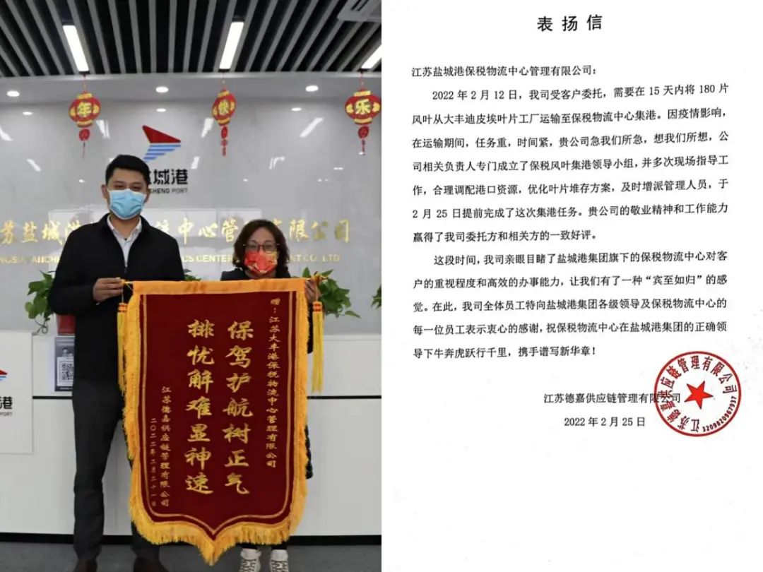 鹽城港保稅物流中心圍繞集團(tuán)黨委“經(jīng)營(yíng)興航年”“改革攻堅(jiān)年”部署要求,秉承“客戶至上,服務(wù)為本”的經(jīng)營(yíng)理念,不斷提升服務(wù)水平,提高專業(yè)素養(yǎng)。同時(shí),保稅物流中心為切實(shí)做好疫情防控工作,針對(duì)進(jìn)出貨物采取劃界作業(yè),裝卸專班人員區(qū)域內(nèi)作業(yè)等要求,真正做到了生產(chǎn)經(jīng)營(yíng)、疫情防控兩手抓、兩手硬、兩不誤。細(xì)致周到、高效便捷的服務(wù)也贏得了社會(huì)各界的廣泛贊譽(yù),部分客戶還特意送來(lái)了錦旗和感謝信以表達(dá)他們的感激之情。