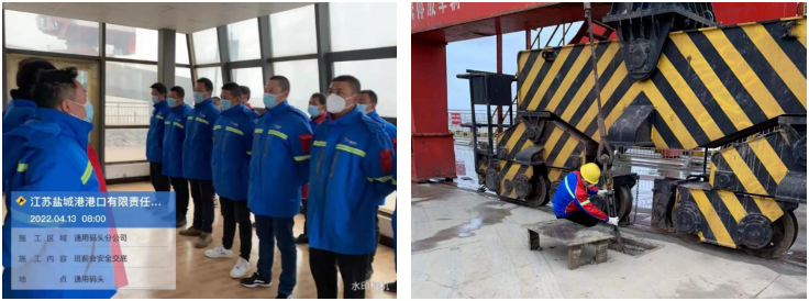 散貨碼頭分公司領導干部帶頭實施24小時值班制度,保障通訊暢通,及時掌握碼頭實時情況。維保人員全力將碼頭機械進行防風錨定,安全及設備人員復查確認,全面排查安全隱患,收回室外高空的積物,以防意外墜落,關閉好門窗,切斷機械設備電源,用強有力的手段應對惡劣天氣影響。