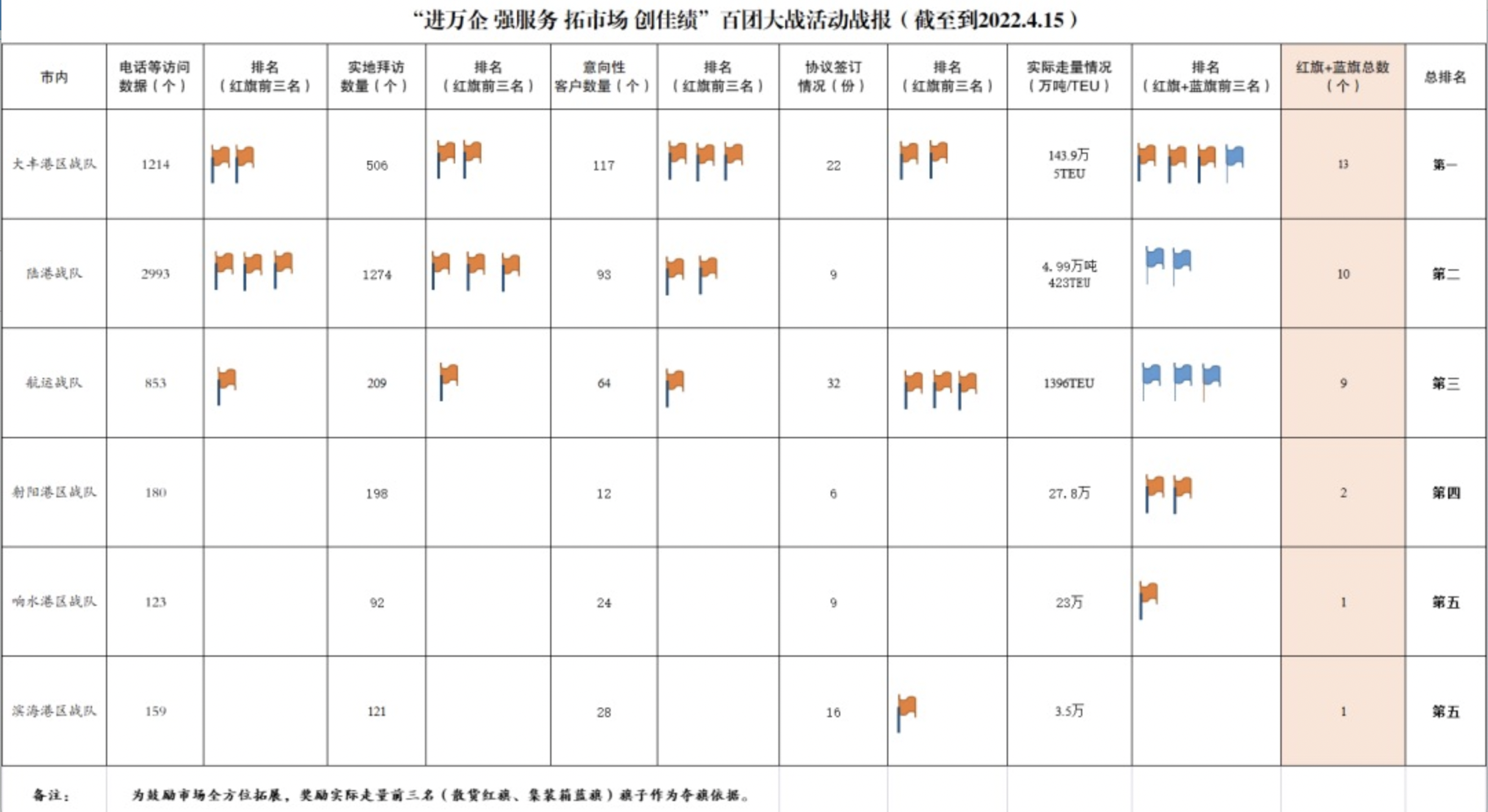 各戰(zhàn)隊(duì)拜訪客戶11156家,其中實(shí)地拜訪客戶2564家,電話、視頻、郵件等方式拜訪8592家,其中意向客戶445家,協(xié)議簽訂109份(其中云簽約19份),實(shí)際走量244.69萬(wàn)噸(其中云簽約10萬(wàn)噸),集裝箱1854TEU(其中云簽約153TEU)。