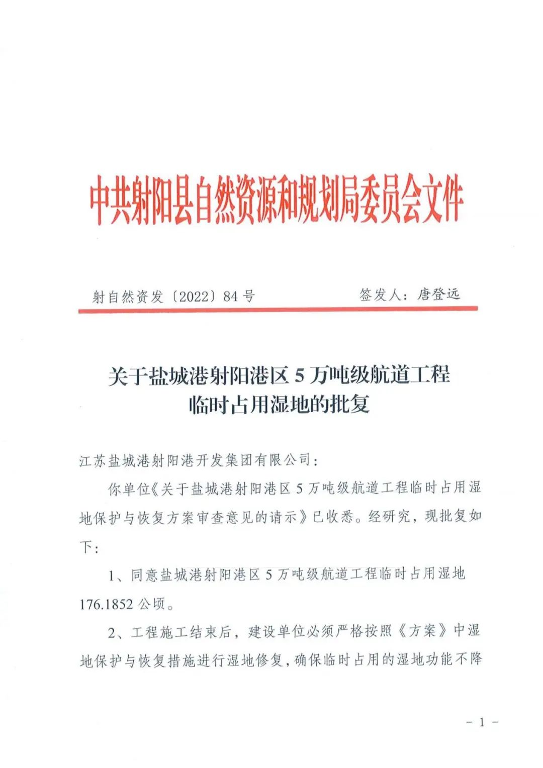 5月9日,鹽城港射陽港區5萬噸級航道工程臨時占用濕地取得縣自然資源和規劃局正式批復。至此,該項目已完成包括立項、通航評估、安全預評價等在內的十二項前期手續,向項目的正式開工又邁進了堅實一步。