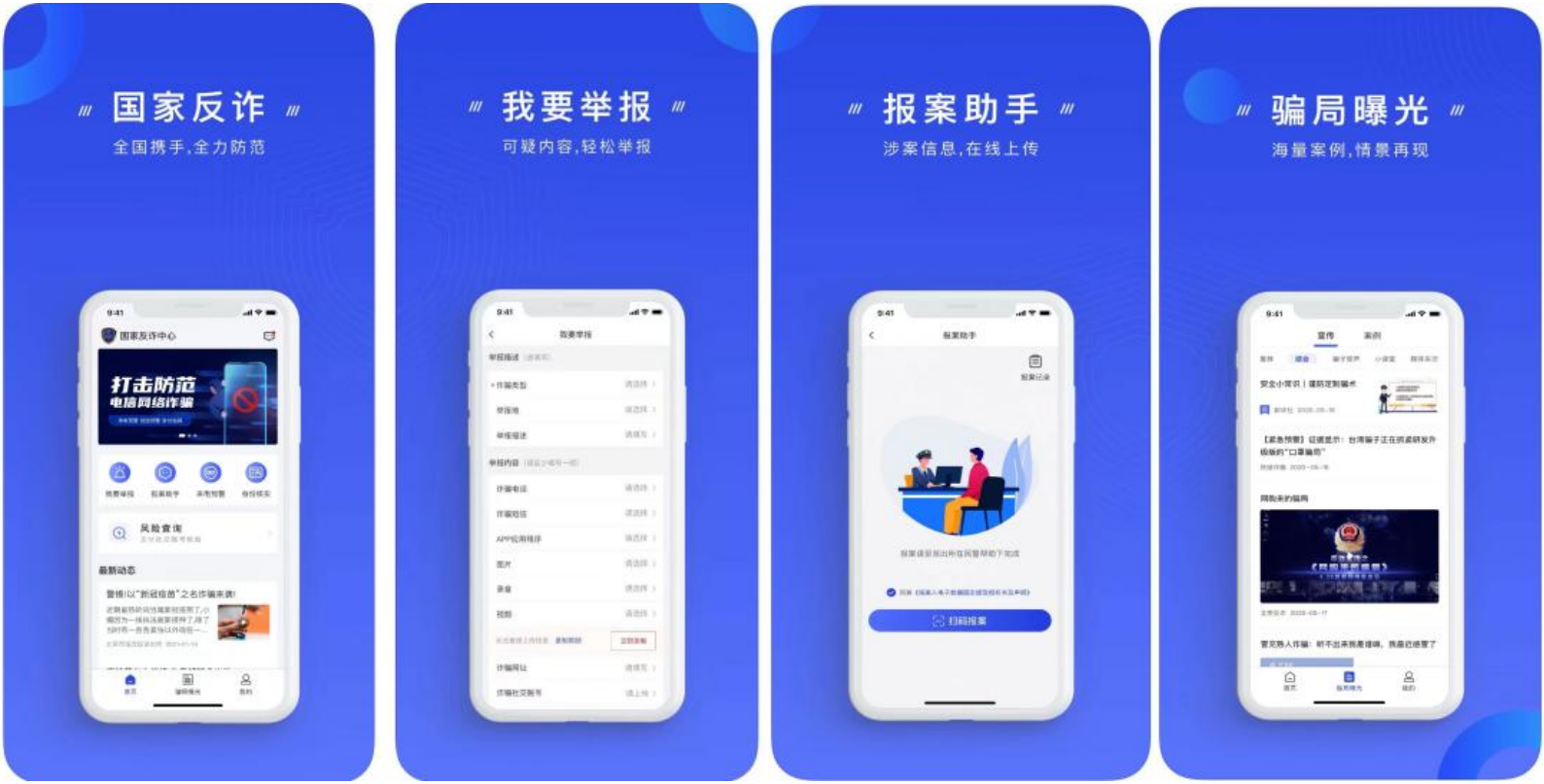 “國家反詐中心APP”是由公安部刑事偵查局提供的用于接受詐騙舉報的APP。它可以免費提供防騙保護,當收到涉嫌詐騙的電話、短信、網址或安裝涉嫌詐騙的APP時,可以智能識別預警;并可以對非法可疑的電信網絡詐騙行為進行在線舉報,為公安機關提供更多的反詐線索,在后臺及時封殺;當涉及陌生賬號轉賬時,可以驗證對方的賬號是否涉嫌詐騙,及時規避被騙風險;平臺還會定期推送防詐騙文章、曝光最新詐騙案例,提高防騙意識。
