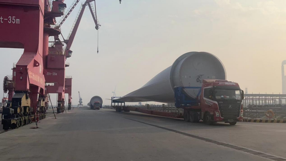 這批風(fēng)電葉片長107米,是射陽港目前已接卸的最長風(fēng)電葉片。超長的葉片帶來了一系列新課題,具體體現(xiàn)在道路運(yùn)輸、港區(qū)內(nèi)陸運(yùn)、碼頭裝卸作業(yè)等方面。射陽港區(qū)生產(chǎn)經(jīng)營團(tuán)隊(duì)迎難而上,主動(dòng)與當(dāng)?shù)卣块T對(duì)接,及時(shí)解決道路運(yùn)輸障礙問題,拆除改造港區(qū)紅門、堆場(chǎng)圍欄等設(shè)施,滿足港區(qū)內(nèi)部轉(zhuǎn)運(yùn)需求;抽調(diào)精干力量組成服務(wù)專班,為客戶提供全程定制化服務(wù);組建裝卸作業(yè)專班,借鑒優(yōu)化百米風(fēng)葉裝卸經(jīng)驗(yàn),制定詳細(xì)作業(yè)方案,從葉片集港、船舶靠泊、場(chǎng)地安排和吊裝作業(yè)等方面做足準(zhǔn)備,安全高效完成首船裝卸作業(yè)工作,打響了“風(fēng)電裝卸服務(wù)”射陽港區(qū)優(yōu)質(zhì)品牌。