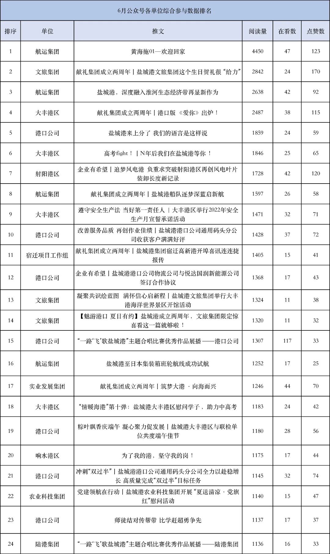 下面,讓我們一起回顧六月份鹽城港集團(tuán)微信公眾平臺(tái)的精彩表現(xiàn)。