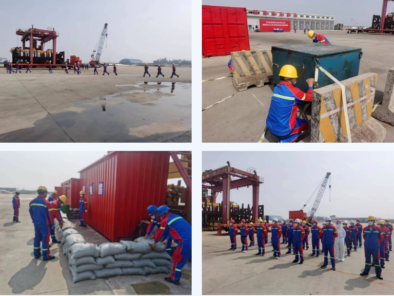 本次演練模擬我區(qū)域即將出現(xiàn)強(qiáng)降雨、8級(jí)以上雷暴大風(fēng)天氣所造成的氣象災(zāi)害情況。演練打響后,安環(huán)科首先通報(bào)氣象預(yù)警信息,向總指揮匯報(bào)應(yīng)急搶險(xiǎn)救援隊(duì)伍和應(yīng)急物資準(zhǔn)備情況,各成員單位根據(jù)各自職責(zé)匯報(bào)防御工作落實(shí)情況??傊笓]按照防汛防臺(tái)總體預(yù)案要求,立即啟動(dòng)“防汛防臺(tái)Ⅱ級(jí)應(yīng)急響應(yīng)”,并下達(dá)非搶險(xiǎn)人員轉(zhuǎn)移、通用堆場(chǎng)區(qū)域緊急搶險(xiǎn)排澇、各類設(shè)備防風(fēng)加固、所有門窗緊閉等防御指令。各小組人員根據(jù)指示,緊密配合,協(xié)同合作,采取停止作業(yè)、轉(zhuǎn)移人員、鉚釘機(jī)械、轉(zhuǎn)移貨物、堆放沙袋、啟動(dòng)強(qiáng)排站等應(yīng)急措施,全力保障人員健康安全、設(shè)備貨物完好。