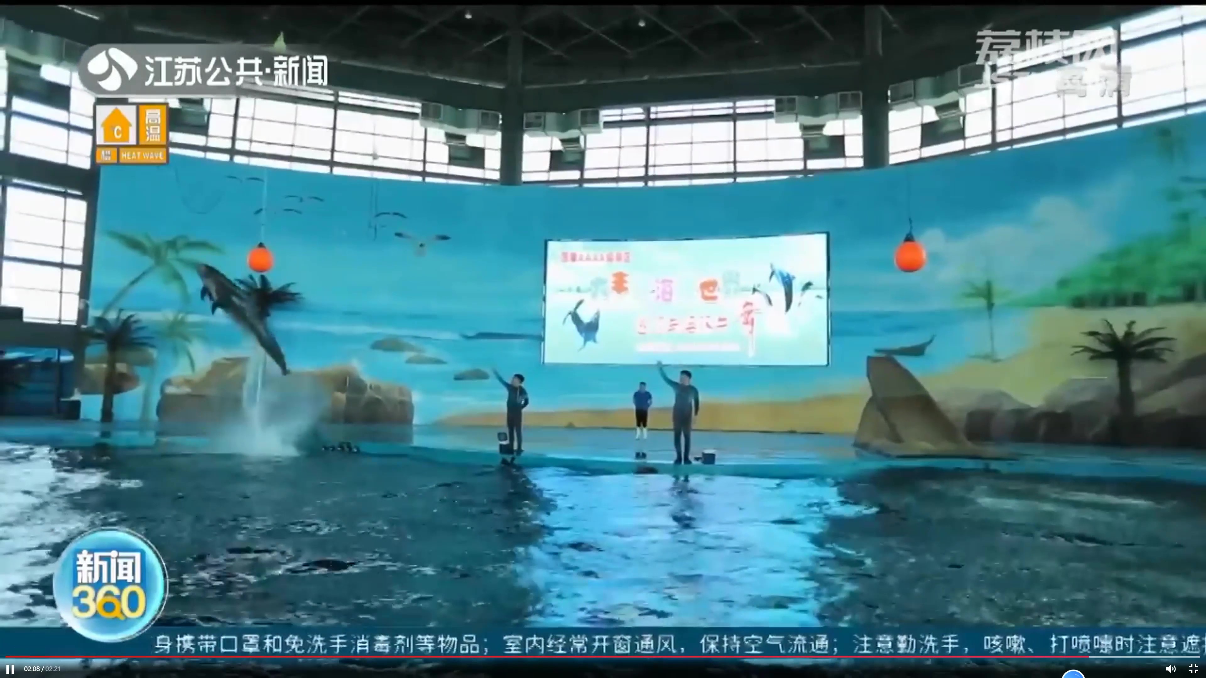 新聞中展示了鹽城港海洋館內的馴養員與海豚互動表演,馴養員時而騎在海豚身上,讓海豚在水池中快速滑翔,時而指揮海豚,讓海豚在水池中高高躍起擊中懸掛的氣球,憨態可掬又靈活精怪的海豚帶來的精彩表演引來現場觀眾陣陣喝彩。