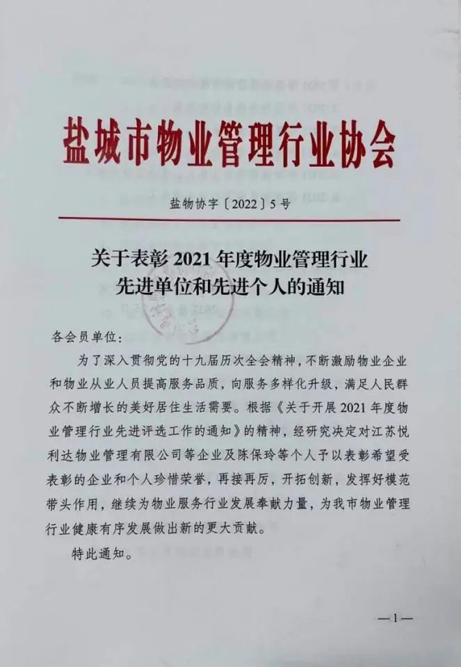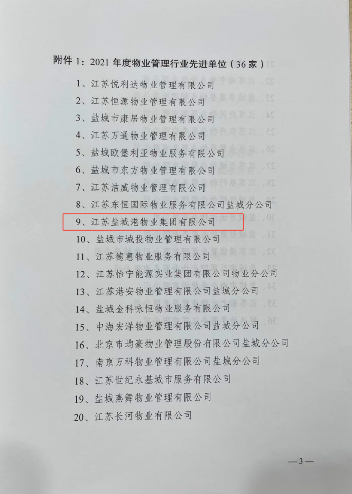 近日,鹽城市物業管理行業協會對全市物業管理行業先進單位和先進個人進行了表彰,江蘇鹽城港物業集團有限公司獲評“2021年度物業管理行業先進單位”榮譽稱號。