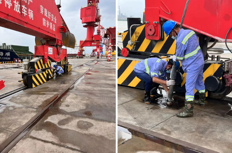 演練模擬安全環(huán)保部人員接到上級氣象災(zāi)害預(yù)警通知,我區(qū)域?qū)⒊霈F(xiàn)強(qiáng)降水、8級以上雷暴大風(fēng)極端天氣。接到通知后,相關(guān)部門立即停止室外作業(yè),緊急啟動《防臺防汛應(yīng)急預(yù)案》。門機(jī)防風(fēng)演練現(xiàn)場,應(yīng)急演練人員打開隱藏式坑位蓋板,門機(jī)移機(jī)定位、下錨定插板、加固防風(fēng)拉索,快速完成單臺門機(jī)防風(fēng)加固任務(wù)。物流園防汛演練現(xiàn)場,搶險(xiǎn)人員對室外堆場進(jìn)行針對性排水,并用沙袋將倉庫、配電房等重點(diǎn)部位進(jìn)行封堵,迅速完成防洪墻堆建。
