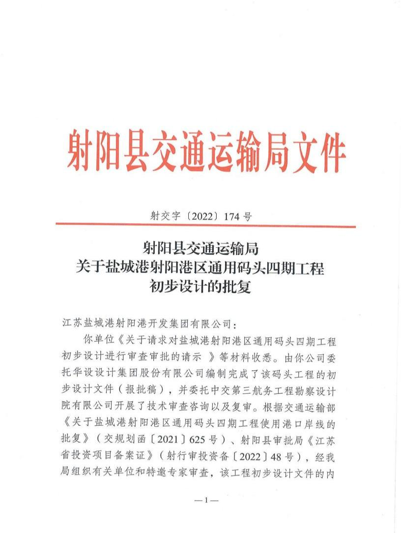 8月30日,鹽城港射陽(yáng)港區(qū)通用碼頭四期工程項(xiàng)目初步設(shè)計(jì)和施工圖設(shè)計(jì)取得正式批復(fù)。至此,該項(xiàng)目已完成所有前期手續(xù),為項(xiàng)目的正式開工奠定了堅(jiān)實(shí)的基礎(chǔ)。