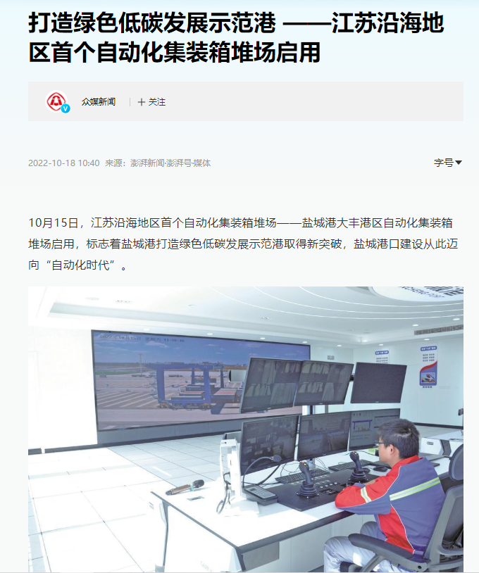 江蘇沿海地區(qū)首個(gè)自動(dòng)化集裝箱堆場(chǎng)——鹽城港大豐港區(qū)自動(dòng)化集裝箱堆場(chǎng)正式啟用