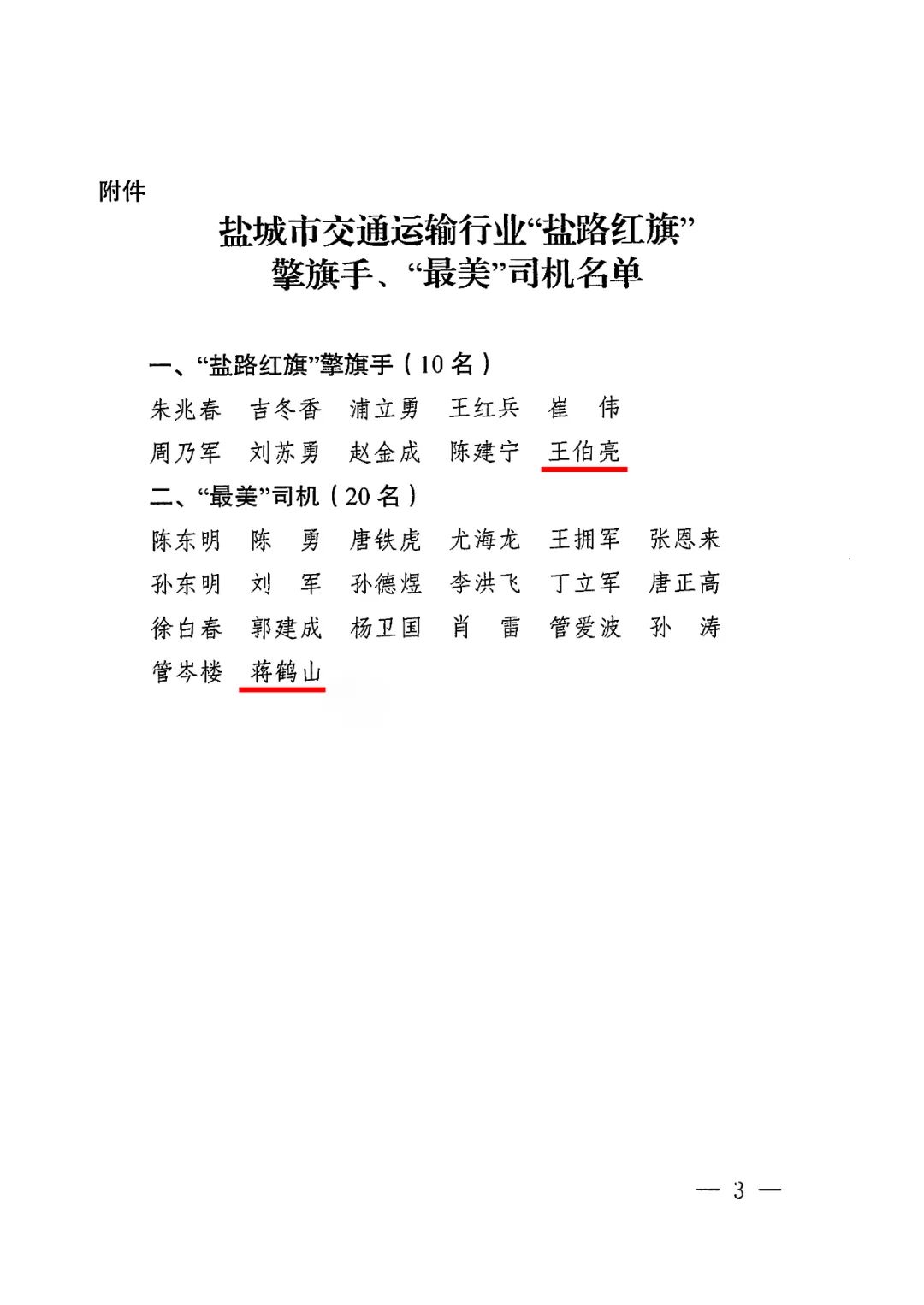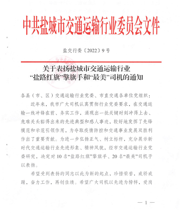 近日,中共鹽城市交通運輸行業(yè)委員會印發(fā)《關于表揚鹽城市交通運輸行業(yè)“鹽路紅旗”擎旗手和“最美”司機的通知》,集團大豐港區(qū)王伯亮榮獲“鹽路紅旗”擎旗手榮譽稱號,集團響水港區(qū)蔣鶴山榮獲“最美”司機榮譽稱號。