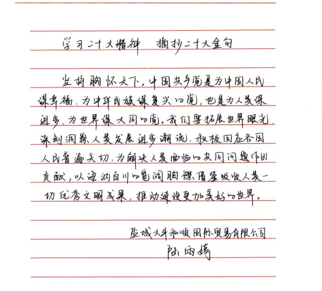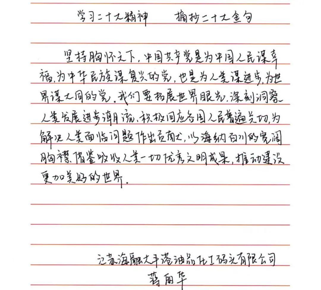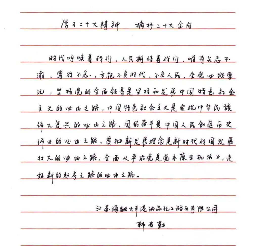 為深入學(xué)習(xí)宣傳貫徹黨的二十大精神,切實(shí)把思想和行動(dòng)統(tǒng)一到黨的二十大精神上來,使黨員干部做到“學(xué)原文、悟原理、知原義”。近日,江蘇大豐港和順科技股份公司黨支部組織開展手抄黨的二十大報(bào)告“金句”活動(dòng),黨員干部積極參加、以筆抒懷,用特別的方式書寫對(duì)黨的赤誠(chéng)忠心。