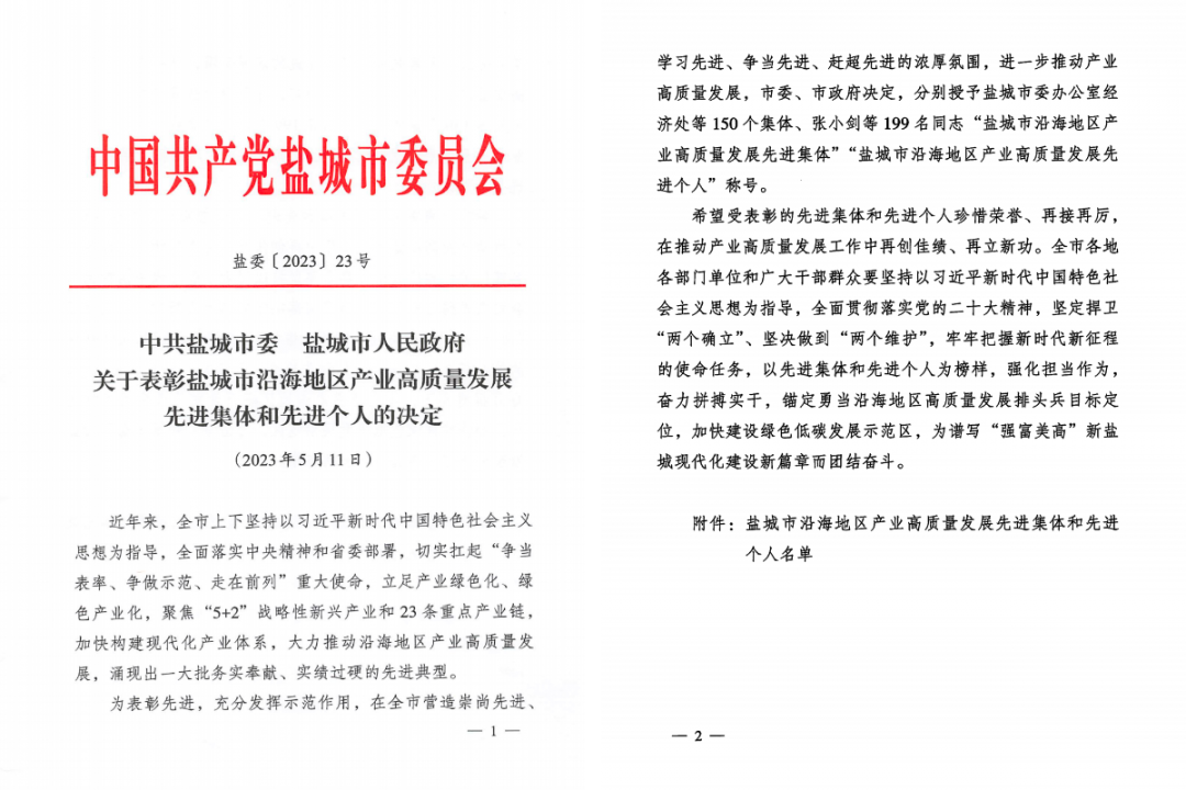 近日,市委、市政府發(fā)布關(guān)于表彰鹽城市沿海地區(qū)產(chǎn)業(yè)高質(zhì)量發(fā)展先進(jìn)集體和先進(jìn)個(gè)人的決定,集團(tuán)獲“鹽城市沿海地區(qū)產(chǎn)業(yè)高質(zhì)量發(fā)展先進(jìn)集體”榮譽(yù)稱號(hào)。
