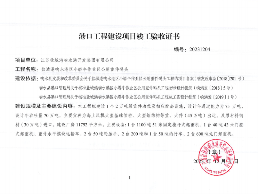 本工程位建設1個2萬噸級重件泊位(水工結構兼顧5萬噸級船舶)及相應配套設施,碼頭前沿設置一臺最大起吊能力達1200噸的固定桅桿式起重機,是目前江蘇沿海港口起吊能力最大的專用重件碼頭。碼頭功能定位為以風電重、大件貨物為主,兼顧鋼材等件雜貨,設計年通過能力75萬噸。此次竣工驗收現場核查組由連云港海事局灌河海事處、連云港海事局響水海事大隊、鹽城市交通運輸局、鹽城市交通運輸綜合行政執法支隊、響水縣交通運輸局、鹽城市響水工業經濟區管委會等相關部門代表及5名特邀專家組成。在驗收會上,核查組認真聽取了項目參建單位的匯報,對工程實體建設情況做出了綜合評價,經會議討論,一致同意該工程通過竣工驗收。