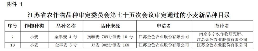 近日,農業科技集團所屬金色農業自主選育的“金豐麥4號”“金豐麥5號”兩個小麥品種順利通過江蘇省主要農作物品種審定,并完成公示程序。這是繼2019年-2023年期間獲審的“金豐麥1、2、3號”后,又一批通過審定的小麥品種,至此,農業科技集團形成具有自主品種權的“金豐麥”品系。