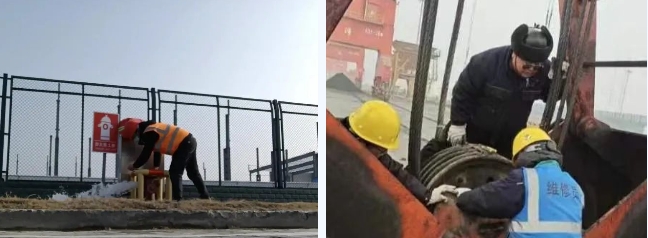 針對突發大幅降溫狀況,港區立即組織“四防”安全專項檢查,在碼頭現場著重檢查高大設備防風、室外管線防凍、機械運行防寒、車輛人員防滑等防范措施的落實和各崗位人員冬季勞保用品規范的配備,保障各項防寒潮措施落地生根;同時檢查了現場應急物資儲備,確保防滑沙、融雪劑、除雪工具等數量充足,存放規范。