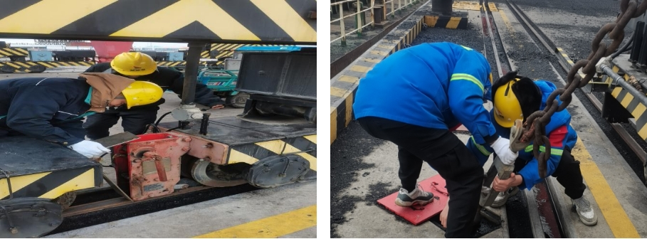 是班組長、是設(shè)備保障員,也是黨員。“我是黨員我先上”是我們每個人的行為準(zhǔn)則。寒潮來臨前,他們仔細(xì)檢查門機(jī)錨定插板、防風(fēng)拉鎖、防爬器、鐵楔是否完全插入槽內(nèi);利用加桿檢查鏈條連接環(huán)是否受力至最大值;嚴(yán)格檢測防爬器是否落地牢靠;確保惡劣天氣下港區(qū)安全有序。