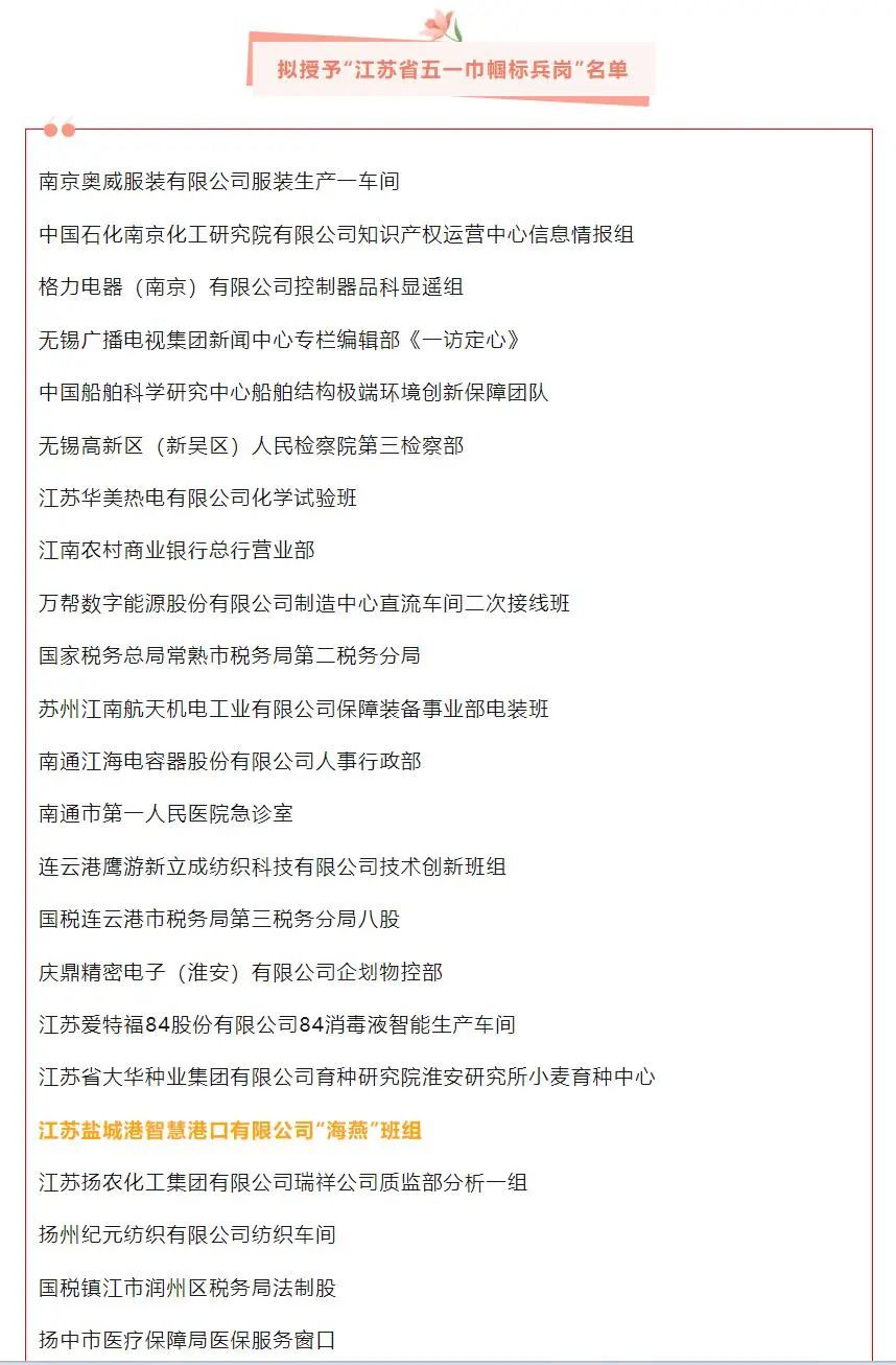江蘇鹽城港智慧港口有限公司“海燕”班組榮獲“江蘇省五一巾幗標兵崗”!!!