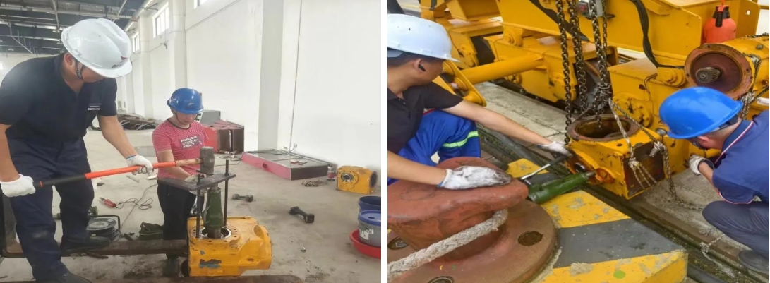 一線現場,總能看到港機公司維保人員忙碌的身影。在接到建湖港區的龍門吊行走減速箱出現故障,需要對設備進行緊急檢修的任務后,他們迅速到場排查出故障原因,手持工具邊拆卸邊檢修,盡管揮汗如雨,但他們絲毫不在意,用心保障著港口的每一處機械設備的運轉。
