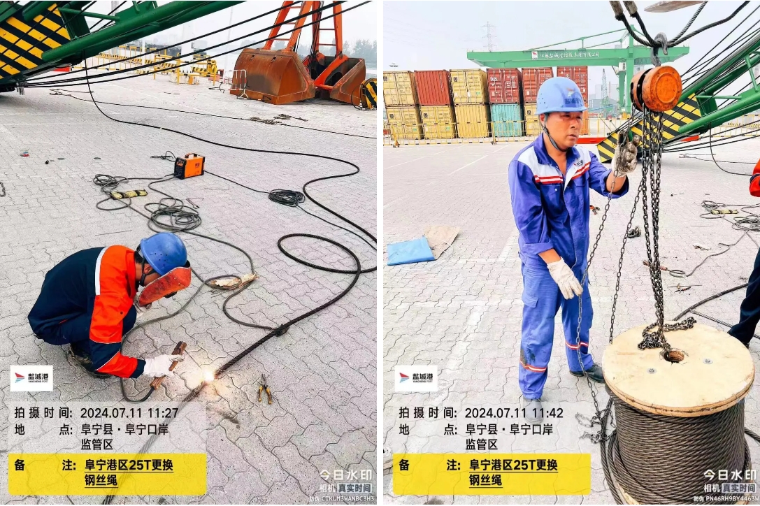 坐標定位:阜寧港區25t固定吊的鋼絲繩更換項目現場