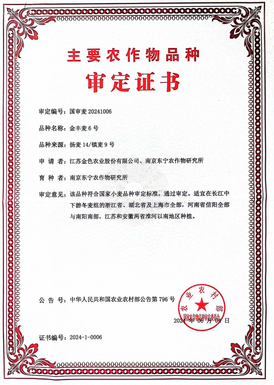 近日,農業農村部發布第五屆國家農作物品種審定委員會第四次主任委員會會議審定通過的作物品種,農業科技集團所屬金色農業選育的小麥新品種“金豐麥6號”通過國家審定。