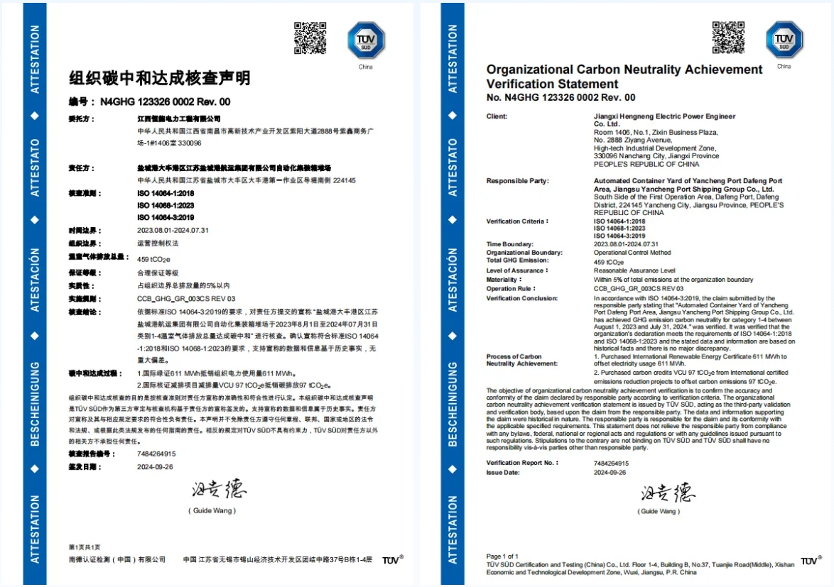 9月26日,鹽城港大豐港區江蘇鹽城港航運集團有限公司自動化集裝箱堆場獲得TUV南德意志集團頒發的《組織碳中和達成核查聲明》,成為國內首個獲得“碳中和”認證的堆場項目(TUV南德意志集團成立于1866年,總部位于德國慕尼黑,是世界上規模最大、最古老的TUV檢驗機構)。這是繼2023年鹽城港自動化集裝箱堆場獲得碳中和承諾審定以來,鹽城港在落實國家“雙碳”目標,積極推動港口綠色低碳發展,奮力為鹽城勇當全省發展新質生產力重要陣地“碳路先鋒”做出的又一項重要實踐。