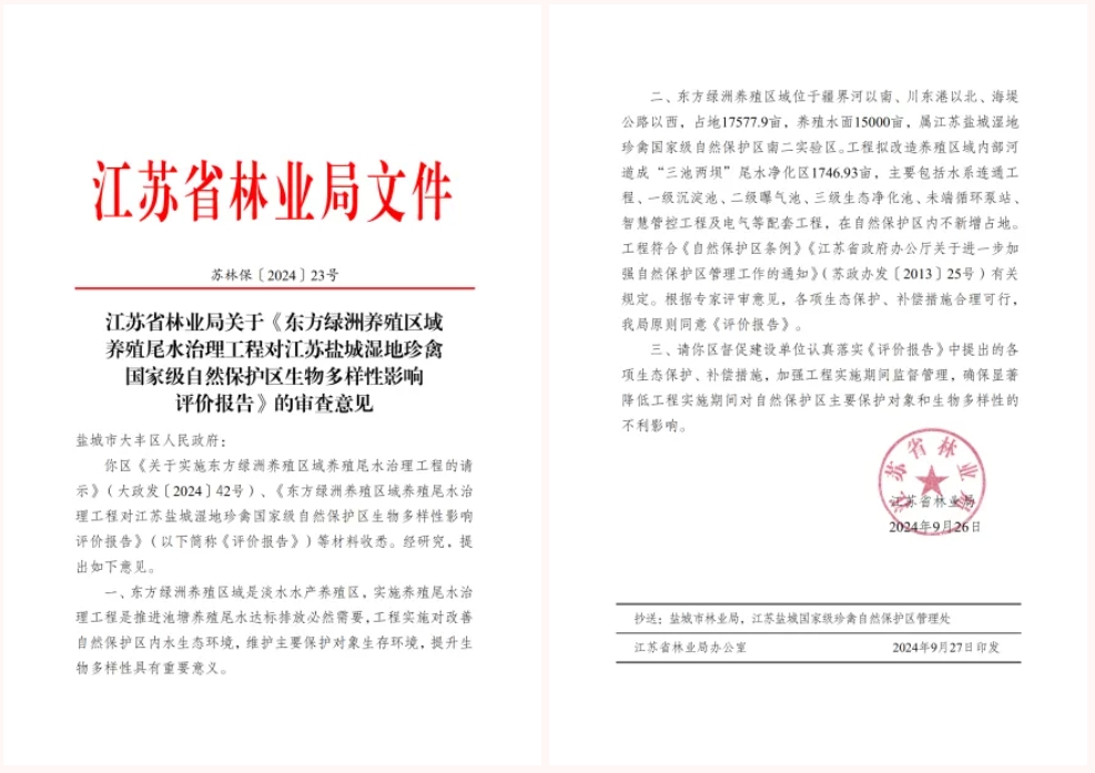近日,江蘇省林業局發布關于《東方綠洲養殖區域養殖尾水治理工程對江蘇鹽城濕地珍禽國家級自然保護區生物多樣性影響評價報告》的審查意見,充分肯定了農業科技集團養殖尾水治理項目在改善自然保護區內水生態環境、維護主要保護對象生存環境以及提升生物多樣性的重要意義,并同意項目實施。